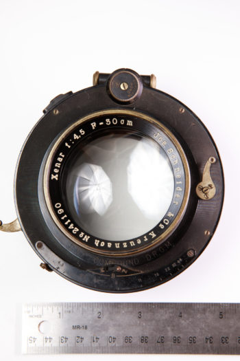 No-name brass lens, 8″ focal length, approximately f4.5 aperture in barrel. This lens does not have a waterhouse slot nor an aperture iris. The glass is in decent condition, but shows some wipe marks/degradation along the edges. The surfaces are smooth and unpitted. The focusing collar works smoothly and the focus knob turns easily. This lens does not include a flange.