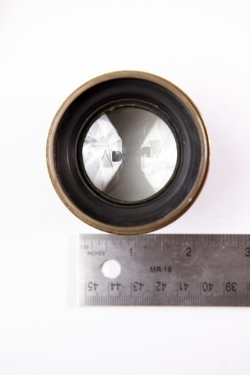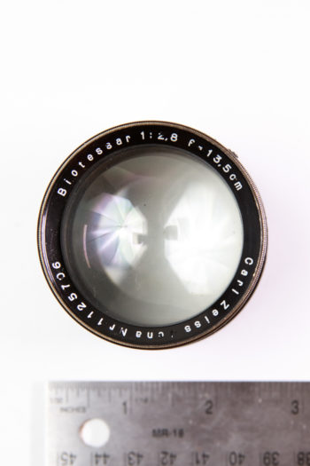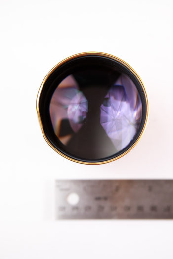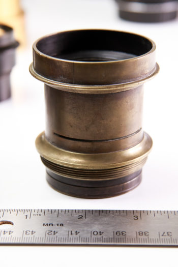 This lens was likely attached to a magic lantern or other projecting device from the late 19th or early 20th century. The brass has a magnificent patina. There are no markings on the lens save for “8 IN” prominently engraved on the front and rear barrels. This lens illuminates a 4×5 frame, though not much more – which means that petzval swirls ought to be easy to produce at that size. Use it for taking portraits on 4×5 with the signature petzval look.